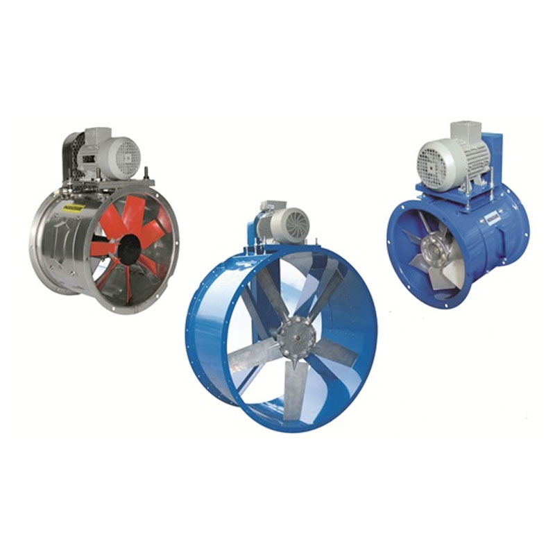 Ventilatorul axial intubat cu transmisie pe curea, protejata de o cutie etansa confectionata din otel sau aluminiu. Motor montat pe platform cu sistem de ajustare a tensiunii in cureaua de transmisie. Carcasa prevazuta cu trapa de inspectie, protejata impotriva intemperiilor cu vopsea pe baza de rasini epoxidice.